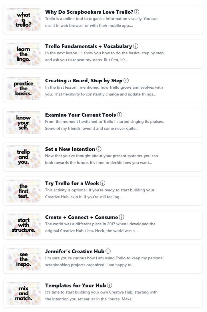 That’s why I created The Trello Habit, a new class inside of the My Simple Scrapper community. In nine lessons across three modules, you will build your own “creative hub” in Trello and learn: