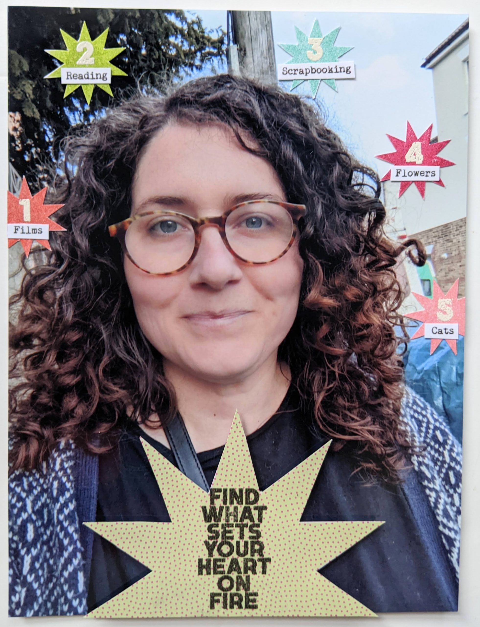 For this layout, Alexa Gill stamped starbursts in different colors, then embossed numbers in white on top. Layered with her typed list of favorites, these five embellishments help communicate her story in a simple way.