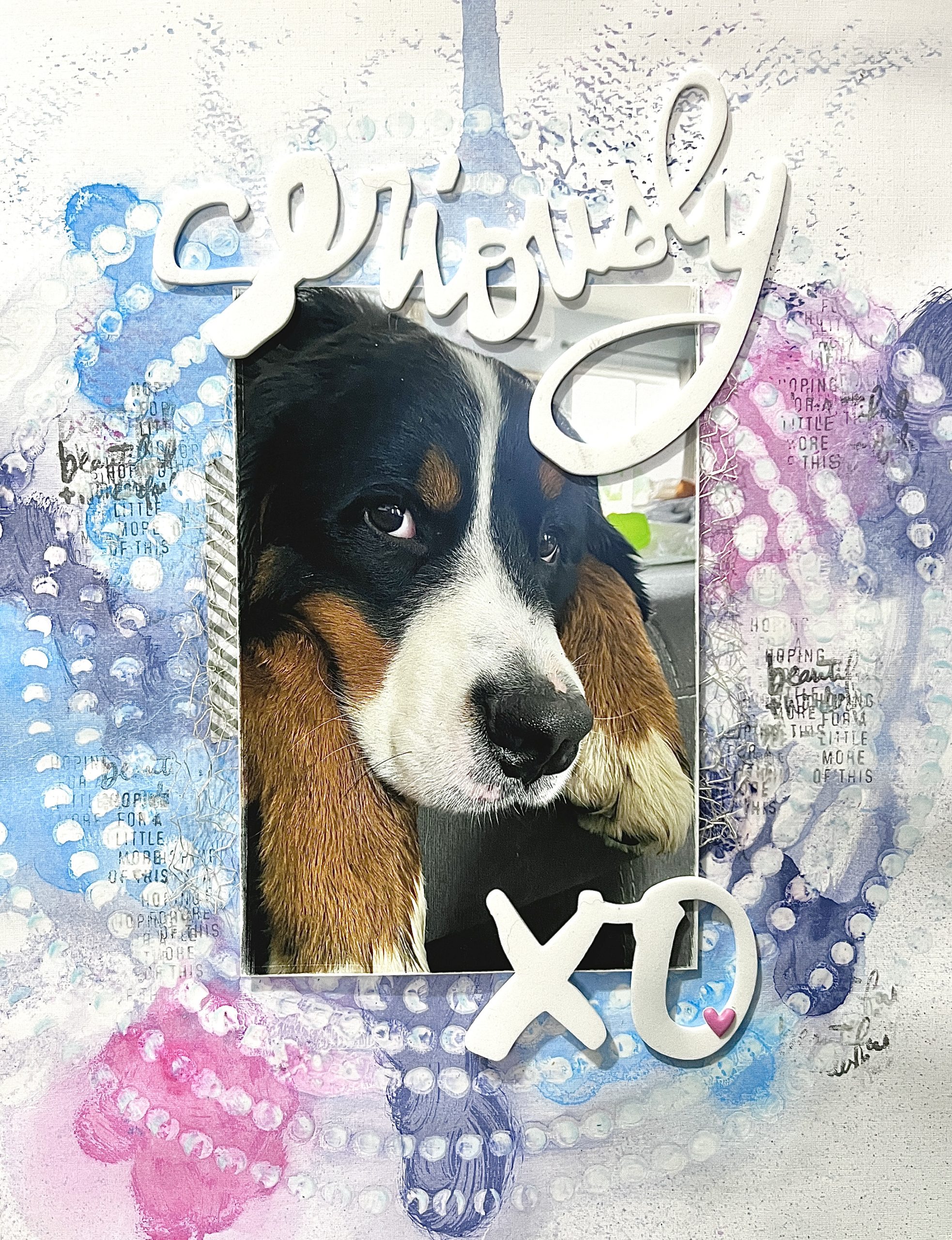 Shannan Manton overlayed multiple digital stamps in this page to create her title and embellishments. By adjusting both the color and transparency she was able to make sure each word or phrase was both visible and legible.