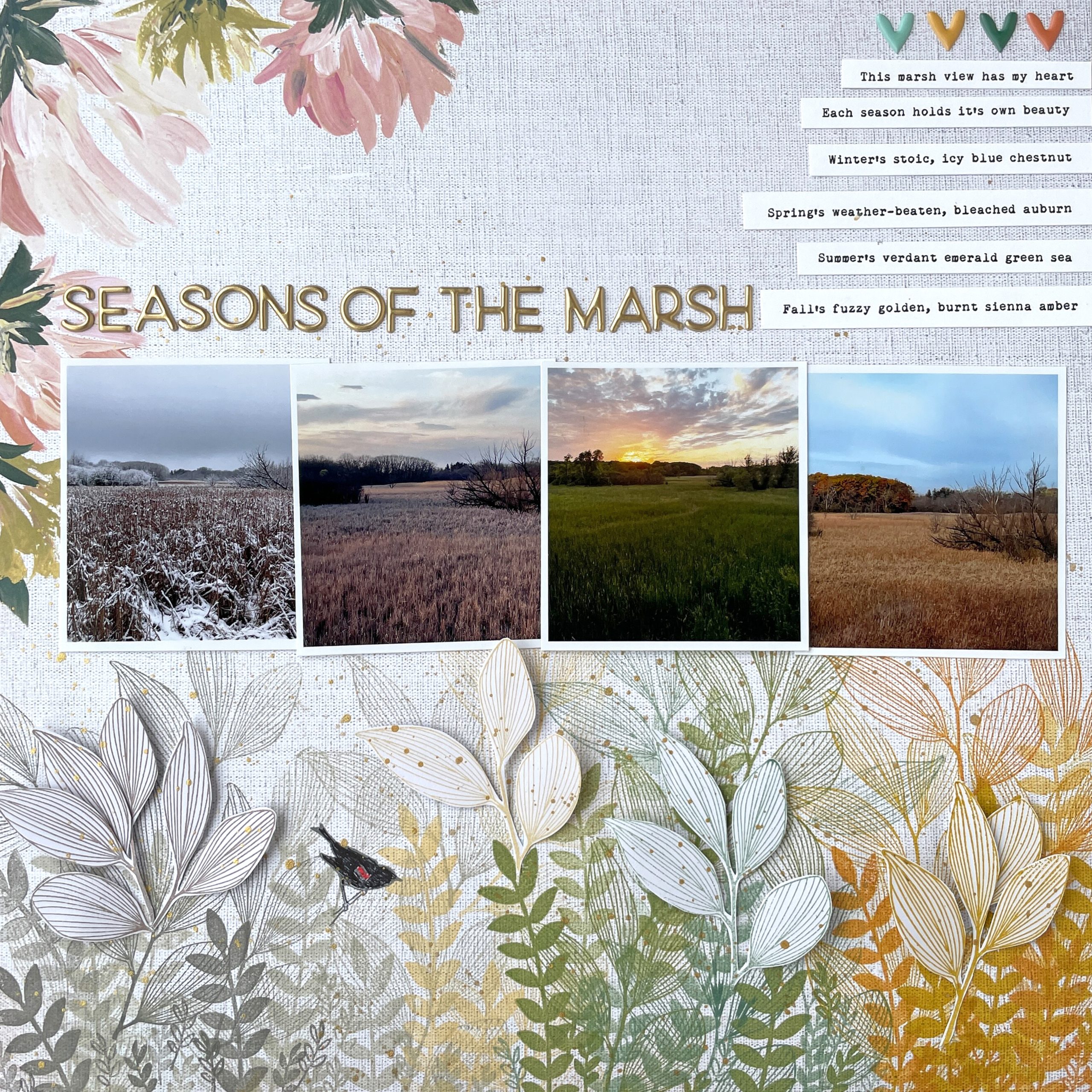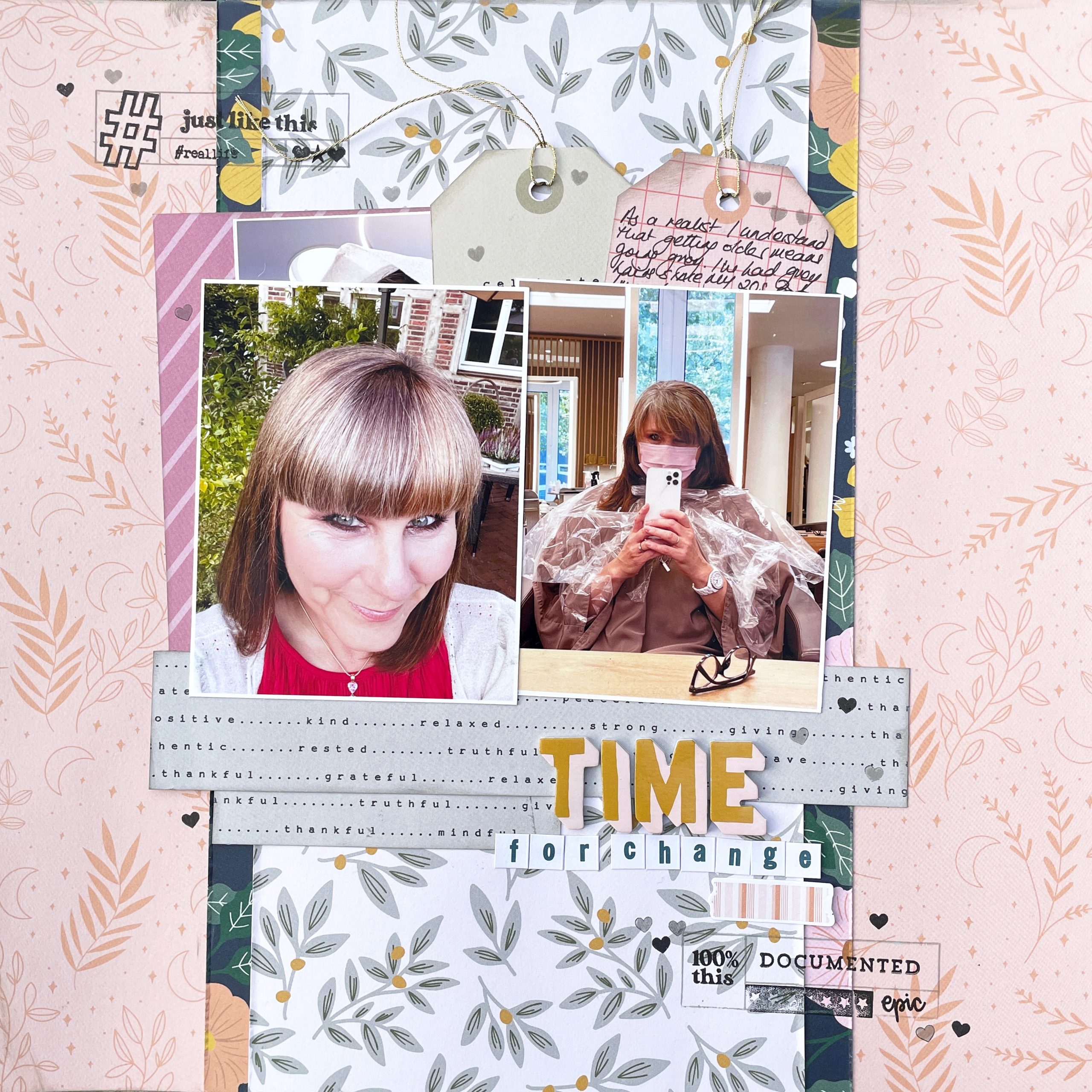 On this layout, Amy Melniczenko recolored her digital stamps to match the patterned papers she chose and bring cohesion to the layout. With paper, this would like choosing 2-3 ink colors to match the most colorful or busy patterned.
