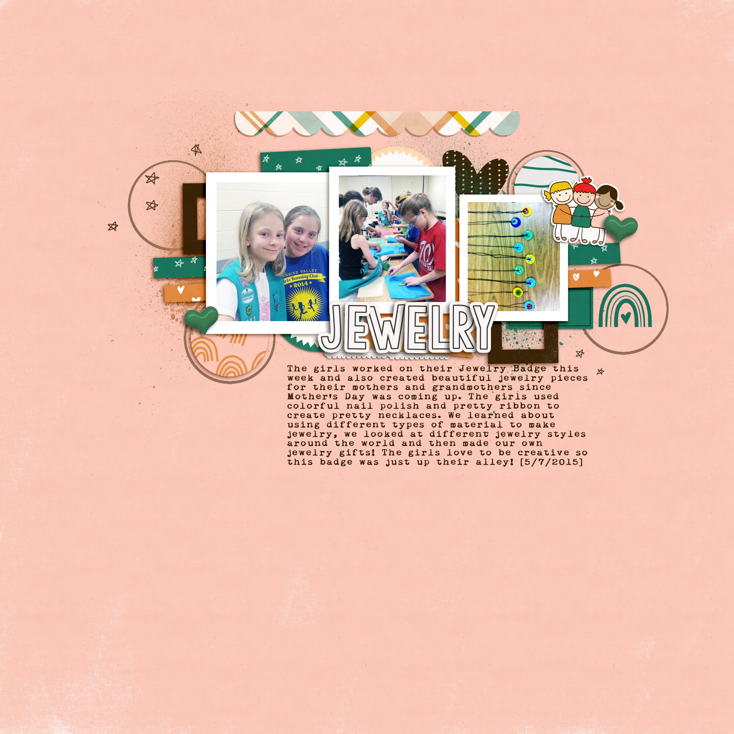 In this layout Jen Johnson used the design of her background paper to select coordinating digital stamps to place behind her photo. You might thing these mixed media style designs belonged to the same kit, but nope. Jen colored them to match her paper.