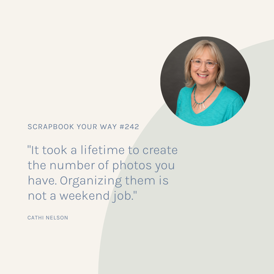 [00:01:05] Jennifer Wilson: Welcome to Scrapbook Your Way, the show that explores the breadth of ways to be a memory keeper today. I’m your host, Jennifer Wilson, owner of Simple Scrapper and author of The New Rules of Scrapbooking. This is episode 242. In this episode I’m chatting with Cathi Nelson, founder of The Photo Managers, a trade organization for photo management professionals. In our conversation Cathi shares her roots in traditional scrapbooking as well as her some of her philosophy on how to manage our modern-day photo libraries with ease.