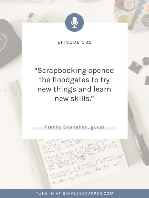 Franky Shanahan: No, I think, I think, um, scrapbooking was kind of the gateway to trying new things. And I think I remember saying to you that one of the things that motivated me to return to scrapbooking 'cause I had sort of dabbled in it previously and as a child and things. But one of the things that prompted me to sort of explore it again as an adult was that I [00:09:00] realized that I was the only person in my house who didn't have a hobby.
