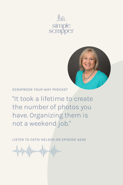 [00:01:05] Jennifer Wilson: Welcome to Scrapbook Your Way, the show that explores the breadth of ways to be a memory keeper today. I’m your host, Jennifer Wilson, owner of Simple Scrapper and author of The New Rules of Scrapbooking. This is episode 242. In this episode I’m chatting with Cathi Nelson, founder of The Photo Managers, a trade organization for photo management professionals. In our conversation Cathi shares her roots in traditional scrapbooking as well as her some of her philosophy on how to manage our modern-day photo libraries with ease.